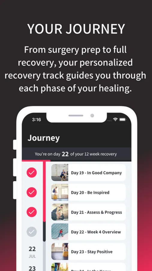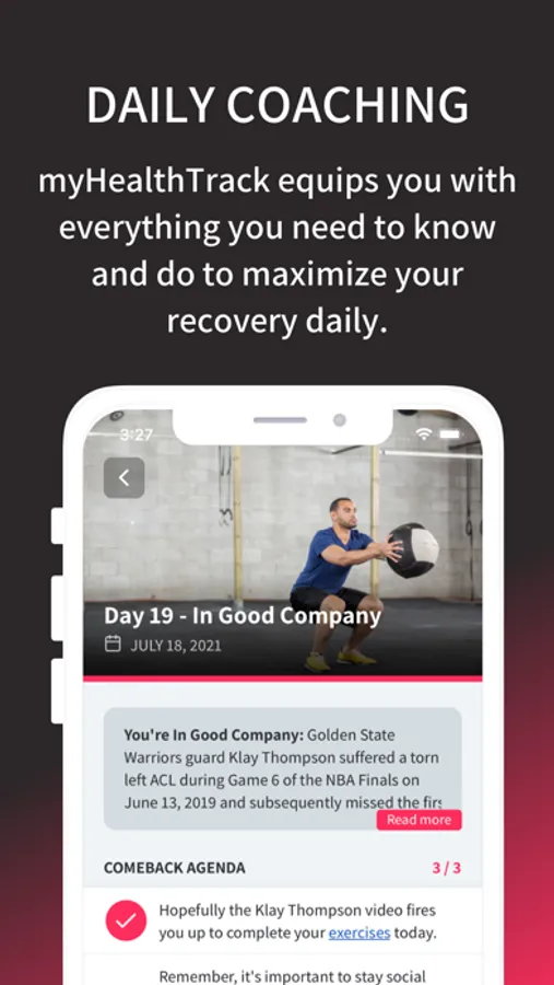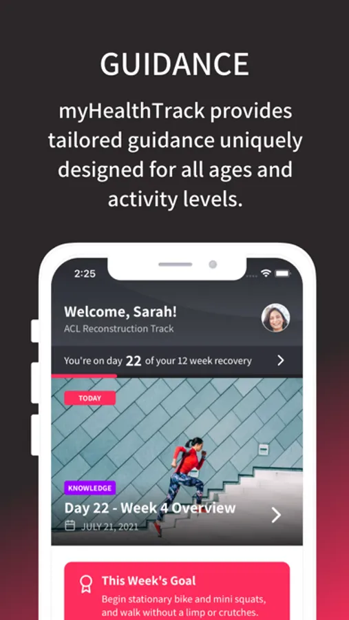 Whether you’re recovering from surgery or trying to avoid surgery, myHealthTrack equips you both mentally and physically for the journey ahead. myHealthTrack offers a world-class recovery experience with elite daily coaching, monitoring, and encouragement. Get back to your life stronger and with more confidence by following your customized recovery track in myHealthTrack.