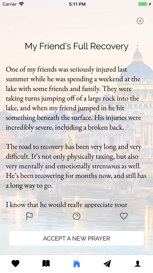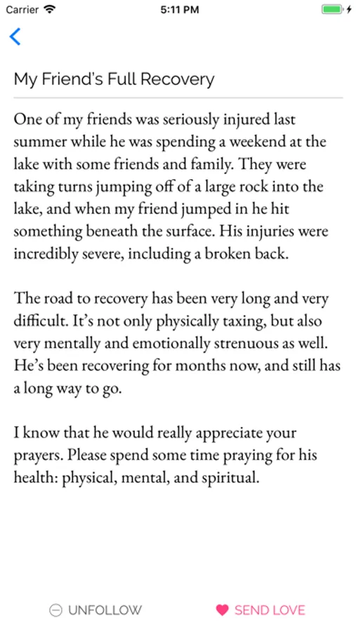 After you accept a prayer, you'll have the option to follow it. Following a prayer allows you to revisit the intention and continue praying for it. It also allows you to receive updates about the prayer request, if the author chooses to share them.
