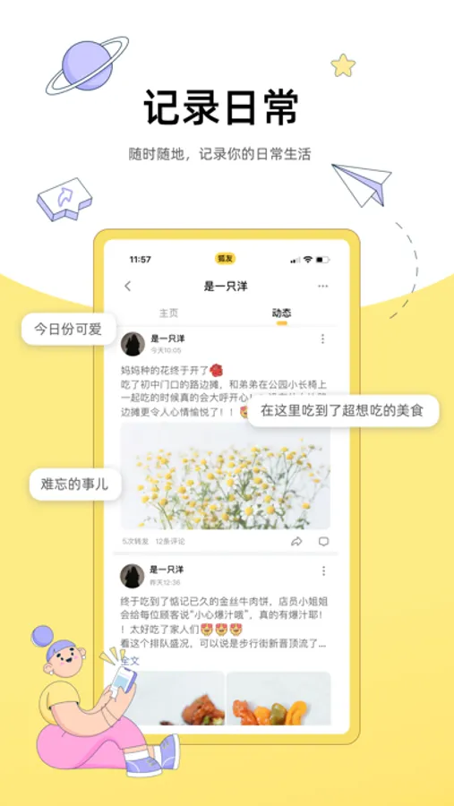 “今日份的自拍来了”、“失眠到深夜”、 “这一刻我酸了”,发布动态,分享你的人生点滴,和狐友一起碎碎念。