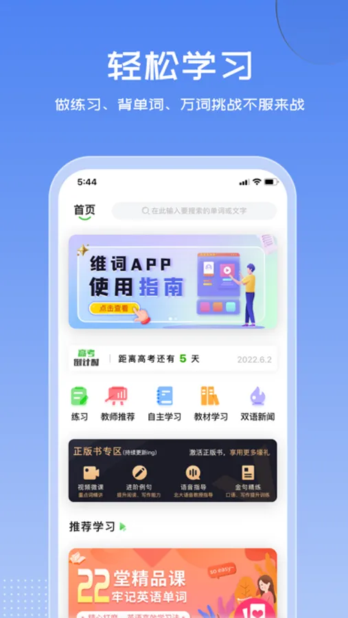 维词是国内高中生自主学习英语词汇应用,内容紧密结合教材,通过经济的语境讲解释义、用法和搭配,自主学习,词汇检测,帮助学生进行个性化英语学习。