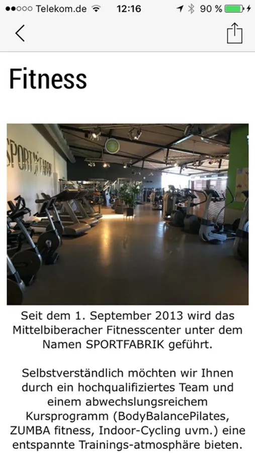 Mit der SPORTFABRIK-App hast Du Deinen Fitnessclub immer in der Hosentasche. Informationen, wie z.B. das aktuelle Kursprogramm, die nächsten Events, Clubfotos und Angebote sind immer dabei und Du erhältst alle News per Push Nachricht.
