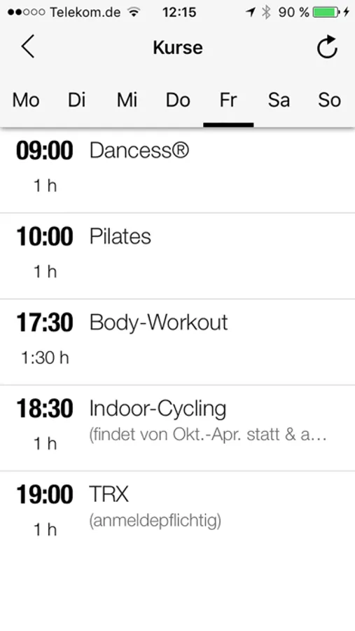 Direkter und aktueller Zugriff auf den Kursplan von überall: Für jeden Kurs kannst Du Details wie Zeit, Kursbeschreibung, Raum und Merkmale wie z.B. den Schwierigkeitsgrad einsehen.