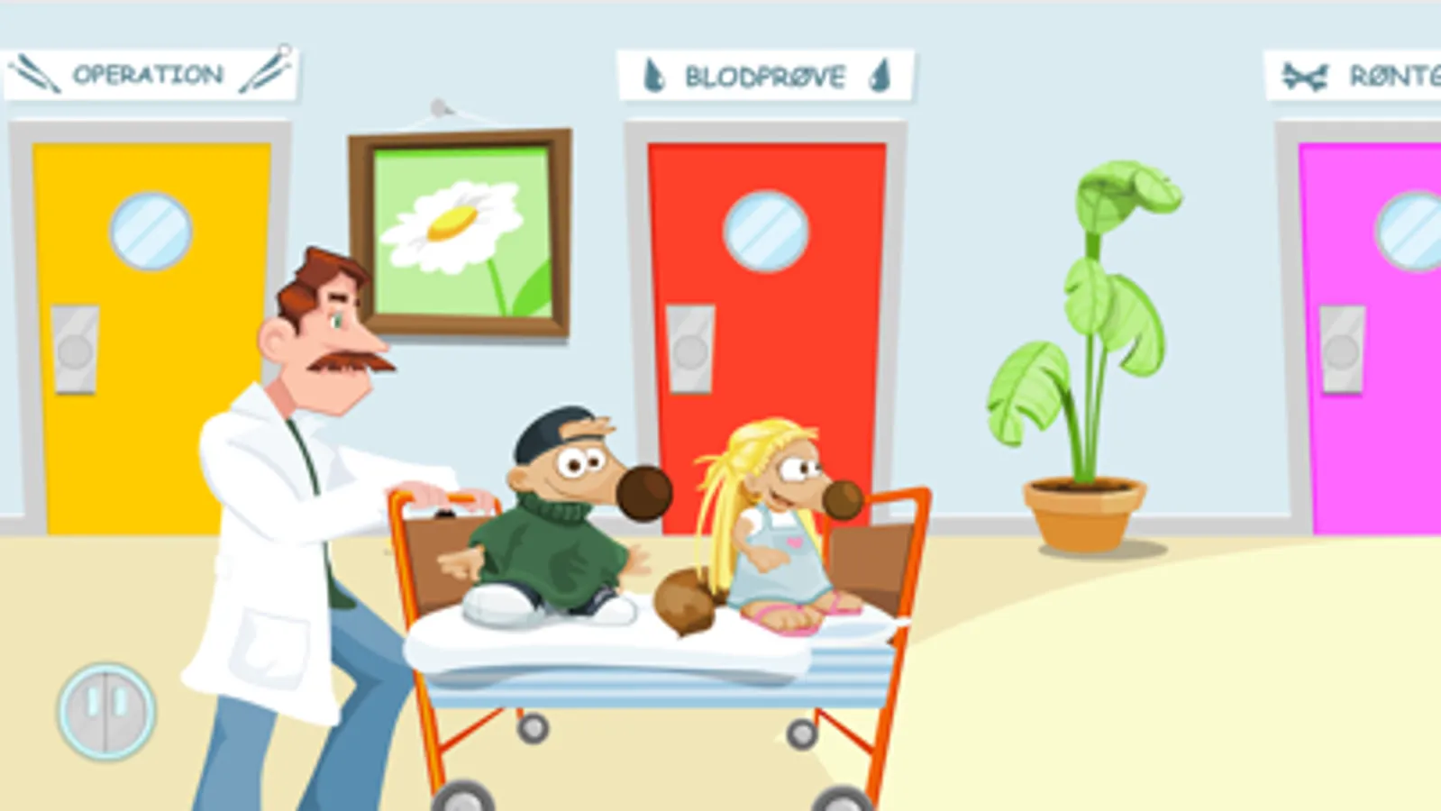 På ’hospitalsgangen’ går portøren Poul med en seng forbi forskellig undersøgelsesstuer, som du kan komme ind i.