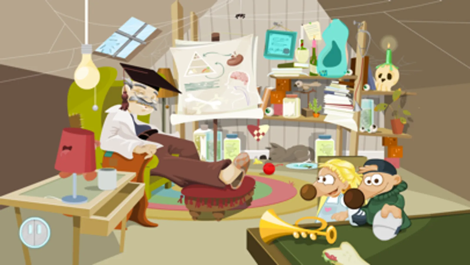 ’Loftet’ findes kun i Rigoland og ikke på andre hospitaler. Der sidder professor Dr. Prop i sin lænestol. Ved at gå på opdagelse her kan du både lære om kroppen og finde sjove overraskelser. Undersøg fx organdukken og plakaten med kroppen. Se hvad både flasken, lampen, øjne, kraniet, katten og edderkoppen kan finde på.
