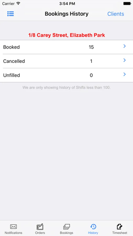 • History - provides a summary of all shifts ever ordered with the agency, including booked, cancelled and unfilled.