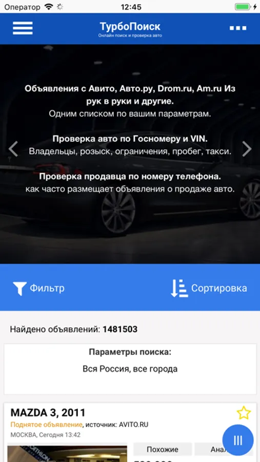 Теперь вам не придется, проводить много времени за просмотром всех автосайтов в поисках нужного вам автомобиля. Все объявления с Auto.ru, Avito.ru, Drom.ru, Юла, Am.ru и Из рук в руки, вы сможете просмотреть на Турбопоиск, одним списком по вашим параметрам! Вам необходимо всего лишь создать фильтр с параметрами вашего поиска (регион, марка, модель, год выпуска, тип кузова, мотор, частные или автосалоны, количество хозяев и прочее), причем количество фильтров не ограничено, и получать звуковые уведомления на ваше усторойство или на e-mail уведомления о выходе новых подходящих объявлений. Вы всегда будете опережать нерасторопных покупателей! Также инструменты Турбопоиска позволяют проверять автомобили по Госномеру или vin номеру, по всем ведомственным базам на предмет угона, дтп, ограничений, регистрации, истории и честности пробега, использования автомобиля в качестве в такси, оплаченных и неоплаченных штрафов (что бы понять в каком режиме эксплуатировался автомобиль) и т.д. + полная проверка продавца (ФССП, Паспорт, сколько и какие авто продавал в последнее время) и все это в любом городе и регионе России!