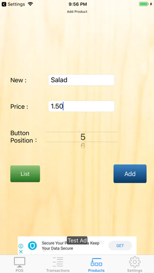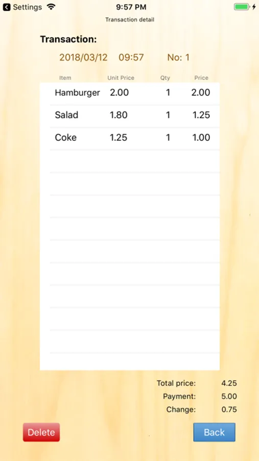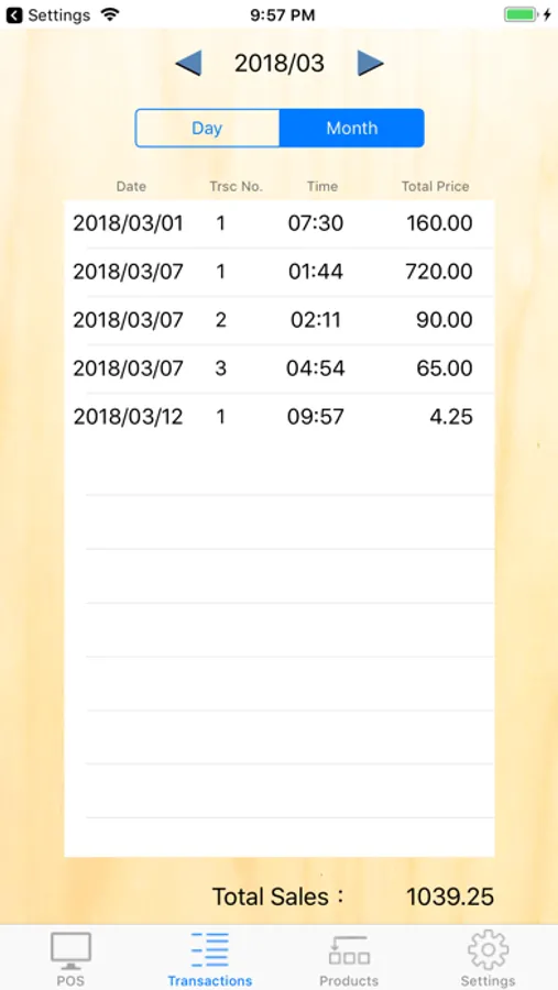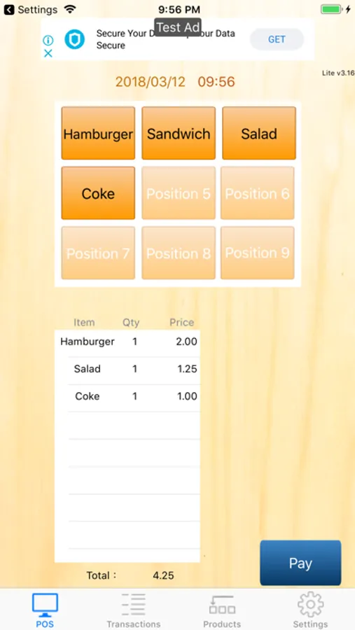 -[POS] screen: The main operation screen. Choose items customer buys and tap button "Pay", then it shows the total price customer should pay.