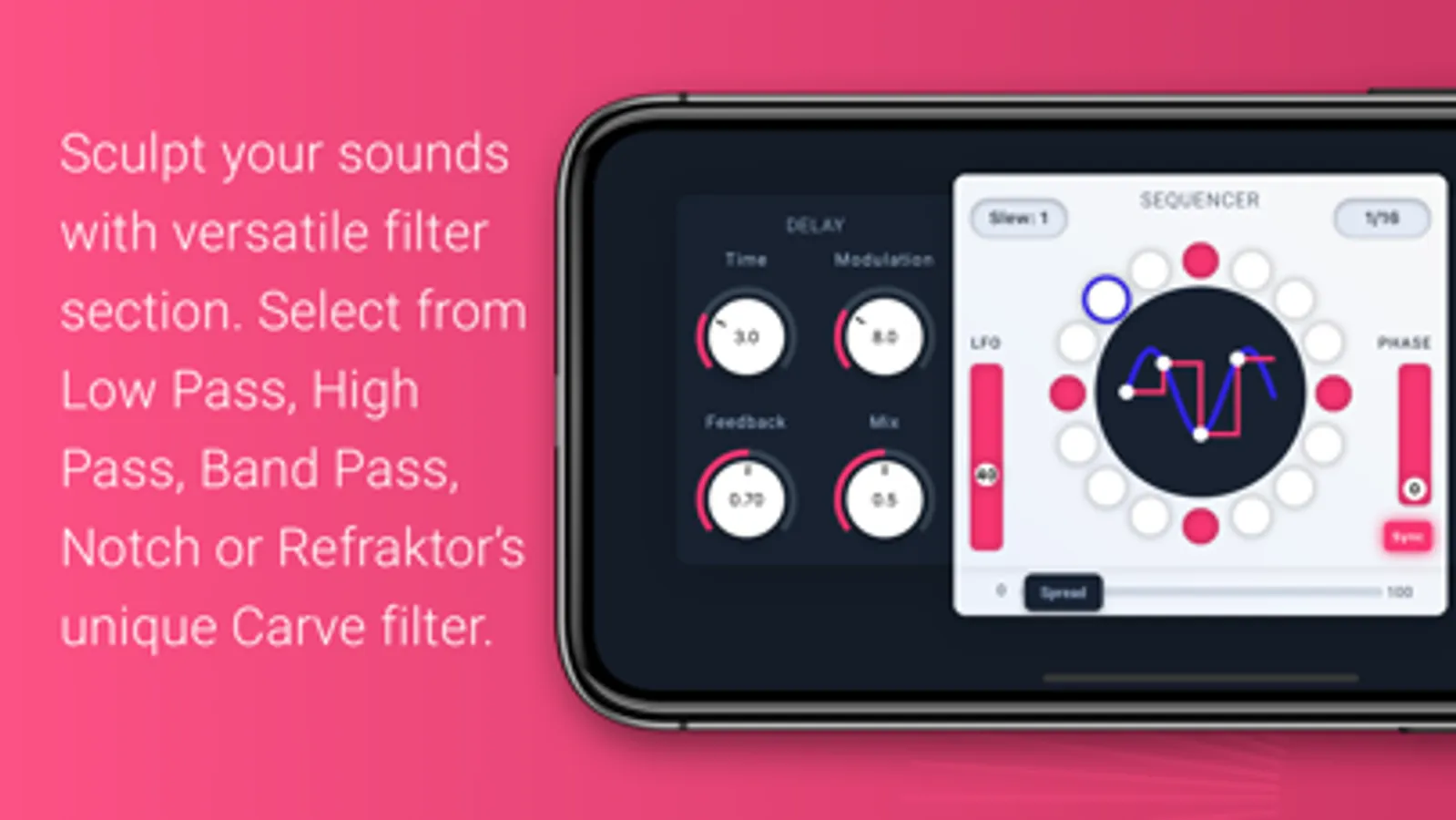 The dedicated filter section makes it simple to sculpt your sound. Select from a range of versatile filter types: Low Pass, High Pass, Band Pass, Notch and FS Refraktor’s unique Carve mode.