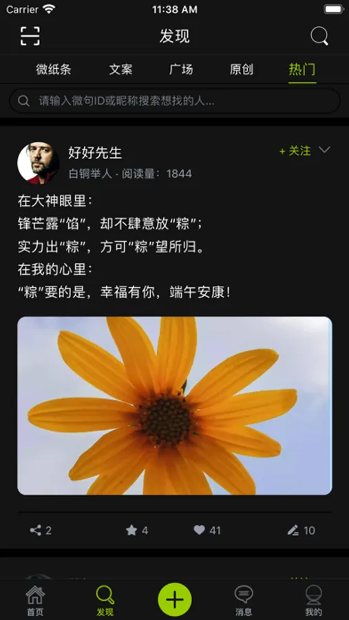 1. 微句:一句不简单的话,一句创意共鸣的话,一句关于「 生活」经历和「 人生」体会的话。或源于看了一部电影、看了一本书、看到了一句话、听了一首歌、经历了一件事、想到了一个点子、领悟到了一个道理,或展现独特见解,或表达人生感悟,或书写生活的喜闻乐见,或分享幽默诙谐~~~