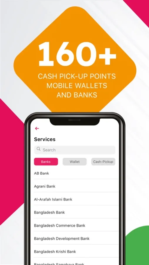• Send to over 160 cash pick-up points, mobile wallets, and banks