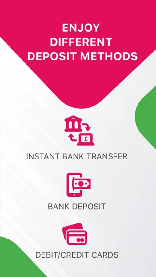 • Enjoy different deposit methods; Bank deposits through Faster Payments and Open Banking, and Credit/Debit cards