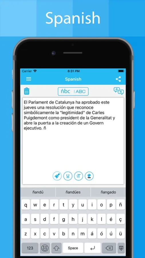 Spanish keyboard app will allow you to write message, story, facebook posts, blogs, Emails in Spanish language.