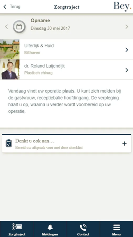 Mijn Bey is een gratis applicatie voor telefoon, tablet en desktop en is altijd en overal beschikbaar. Mijn Bey biedt u op een efficiënte wijze, alle informatie over uw behandeling en persoonlijke zorgtraject. Voor, tijdens en na de behandeling ontvangt u specifieke, relevante informatie in korte berichten en herinneringen in uw persoonlijke tijdlijn. Met de gebruikersvriendelijke app Mijn Bey bent u optimaal voorbereid op de behandeling en uw herstel.