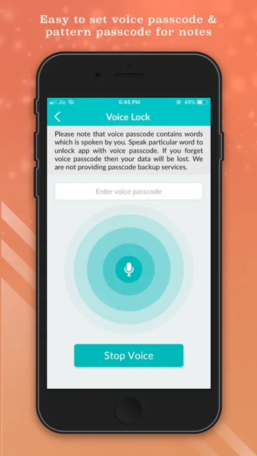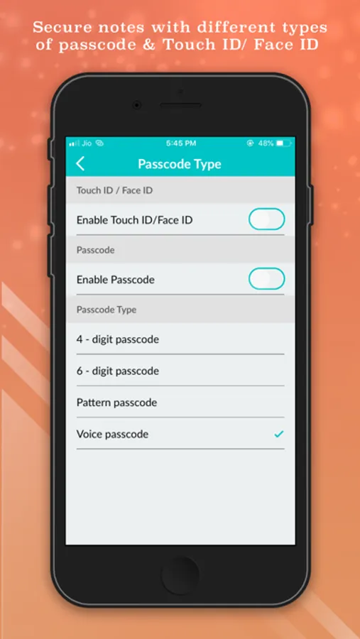 You can secure your note and important data with different type of passcode like 4 - digit passcode, 6 - digit passcode, pattern passcode, voice passcode and Touch ID/Face Id.