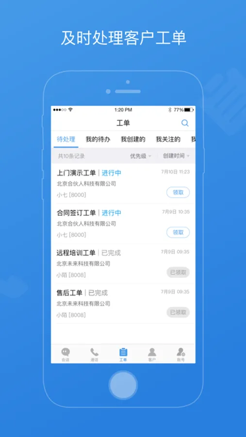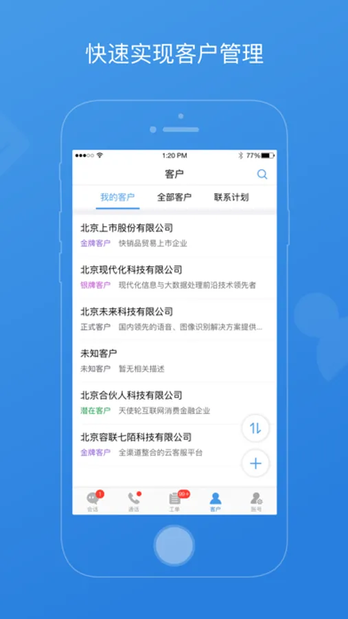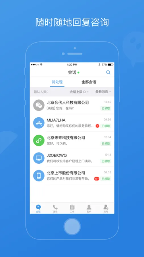 移动坐席除可通过电脑访问云客服平台进行客户服务外,同时为企业客服人员提供移动客服APP,移动客服APP为客服人员以及客服管理人员提供在线咨询、客户管理、工单管理、统计报表等全方位的客户服务于客户管理平台。