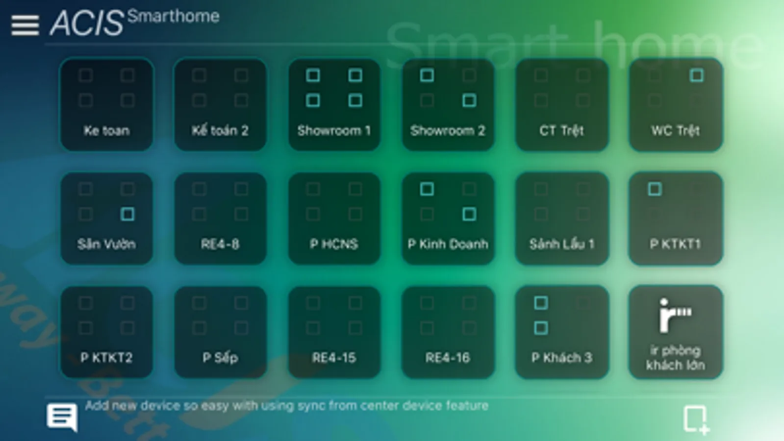 Expressing each room and each floor in a house . You can add , delete a room or a floor like building a house. In addition, you can also change the edit room/floor including change room name , floor name, avatar. Then you will add the devices you have registered in the system 's device Acis into a room.Also move them to the desired location and type of equipment and change their size .