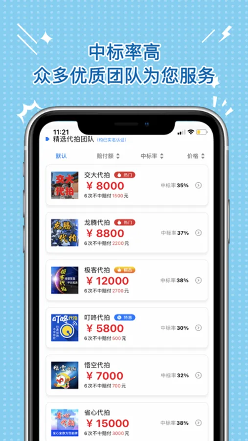 1.去除中间黄牛,直接对接代拍团队,平均中标率行业领先,中标率常年稳定,信誉可靠。拍中才付款,拍不中我们赔您钱。