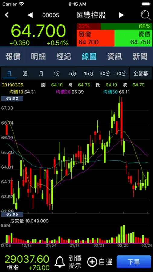 - 提供技術線圖,支援分鐘線、日線、週線、月線,並設有多種技術指標予以參考,亦可自行變更指標設定