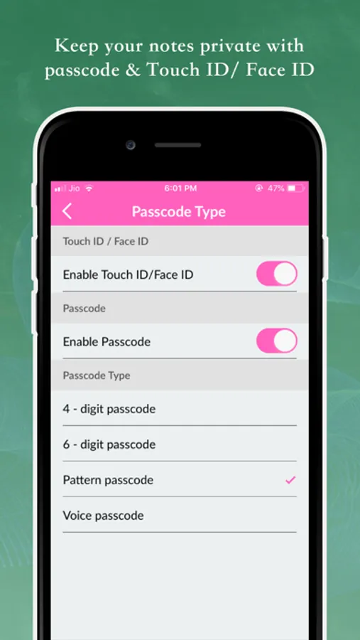You can secure your note and important data with different type of passcode like 4 - digit passcode, 6 - digit passcode, pattern passcode, voice passcode and Touch ID/Face Id.