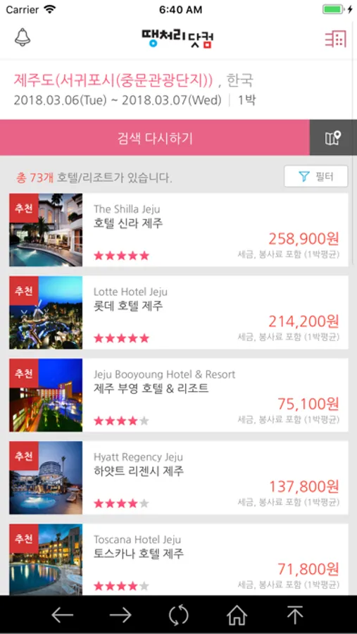 땡처리 제주여행앱을 다운로드받고, 모든 항공권, 모든 호텔(펜션/콘도), 제주도 렌터카, 패스&입장권, 골프, 여행자보험까지 최저가로 예약할 수 있습니다.