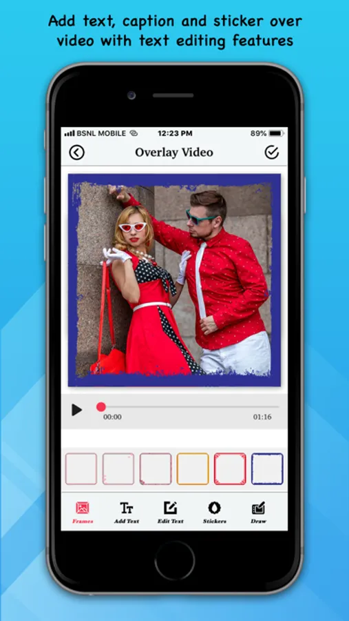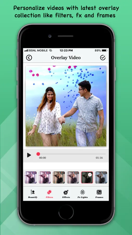 This app also provide different type of video overlay collection like video filters, fx light and frames and video effects like beautify, brightness, contrast, saturation, hue and blur.