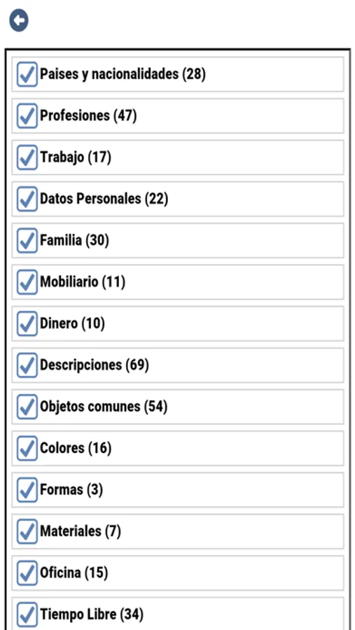 Actualmente dispone solo del nivel 1A2, con mas de 1200 palabras de ese nivel. En un futuro se irán añadiendo los diferentes niveles: 2A2, 1B1, 2B1, 1B2, 2B2, C1 y C2.