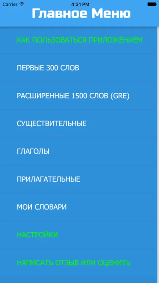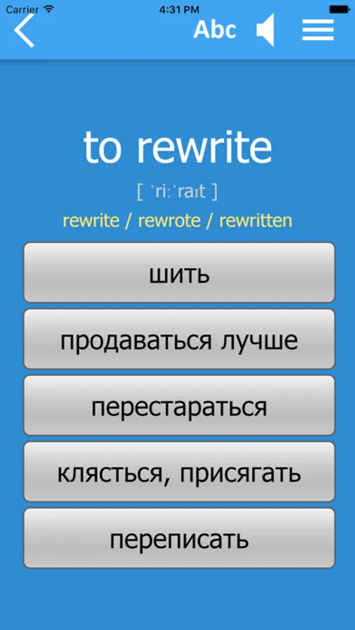 - принцип работы приложения: программа вразброс показывает английские слова (под словом размещена транскрипция, которая поможет правильно произнести слово, также слово по умолчанию произносится программой; чтобы повторно услышать произношение, нажмите на предлагаемое для перевода слово; чтобы отключить произношение, нажмите на иконку динамика в верхнем правом углу экрана) и предлагает варианты перевода на русский язык. Каждое английское слово программа выдает до тех пор, пока вы не выучите его. Приложение считает слово усвоенным, если вы правильно перевели его 6 раз подряд. Затем программа изымает из показов выученное слово.