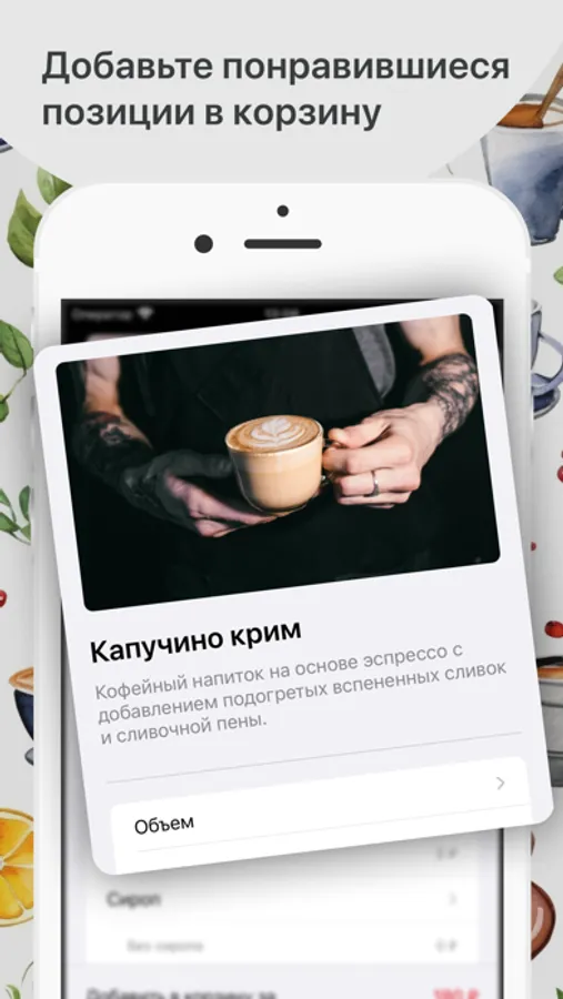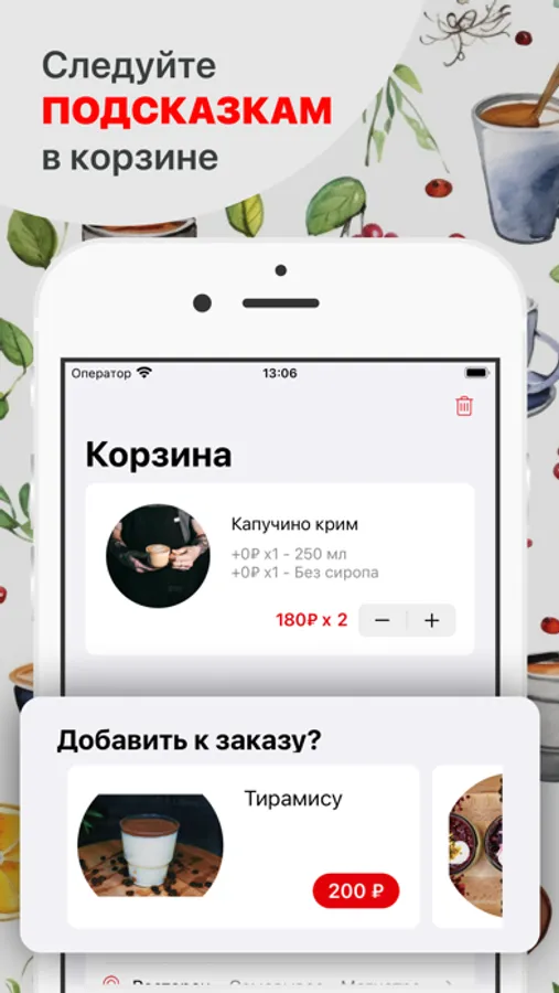 Как сделать заказ в приложении “Правильный Кофе”: выберите понравившиеся позиции из меню, добавьте их в корзину и перейдите на экран оформления заказа (по нажатию на иконку корзины).
