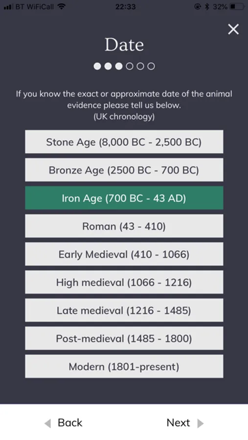 The app provides a guide detailing current knowledge about the animals under study and where their representations might be found. It allows contributors to submit photographs of ancient animal representations (i.e. 2-D painting, 3-D sculpture, physical remains, object/artefact or other). These can be taken in real-time and instantly geolocated, or uploaded from camera rolls with geolocation data added manually.