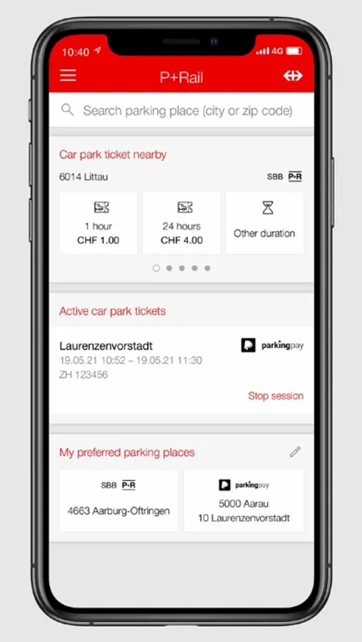 With the SBB P+Rail app, you can pay for your parking quickly and cashfree. The P+Rail app unifies SBB P+Rail parking spaces with those of ten partner railways (BLS, RhB, RBS, TPF, SOB, MGB, OeBB, AB, AVA and Zentralbahn). Parkingpay parking spaces and a large number of parking spaces from municipalities throughout Switzerland round off the largest Swiss parking offer in one app.