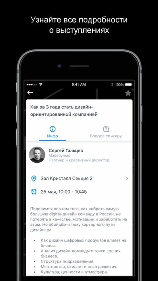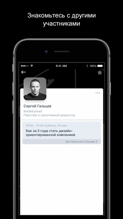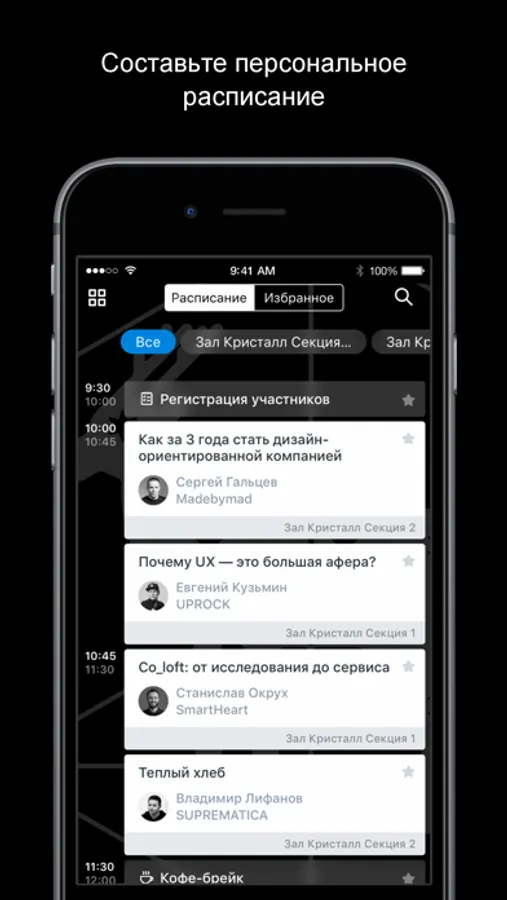- составить собственную программу и получать оповещения о начале избранных докладов,