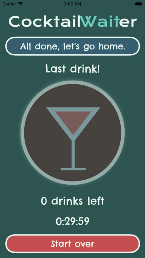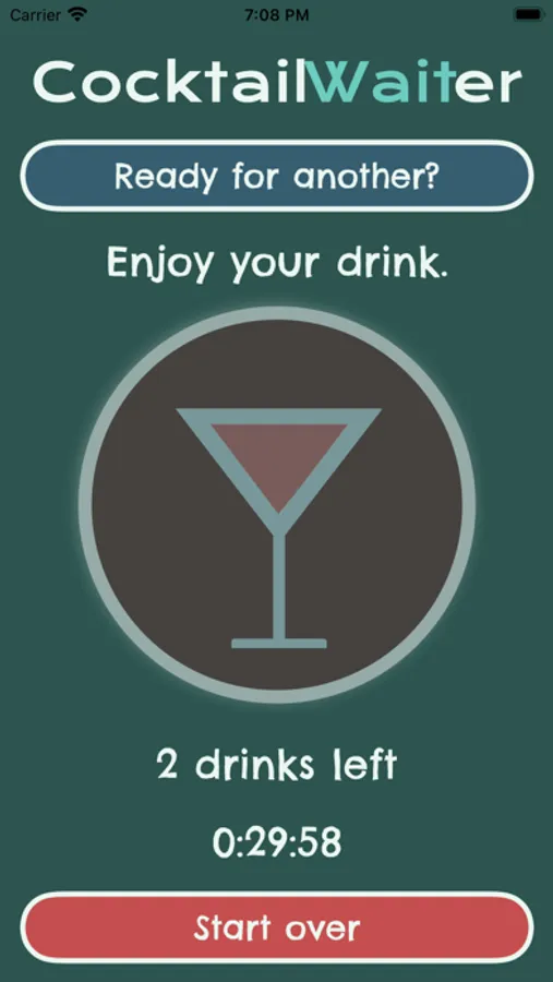 Cocktail Waiter is a simple app that is used to help you pace yourself when you having a few drinks. Simply set the number of drinks you would like to have during the evening, how long each drink should last, and press start. The app will then send you a notification when you are allowed to have another drink.