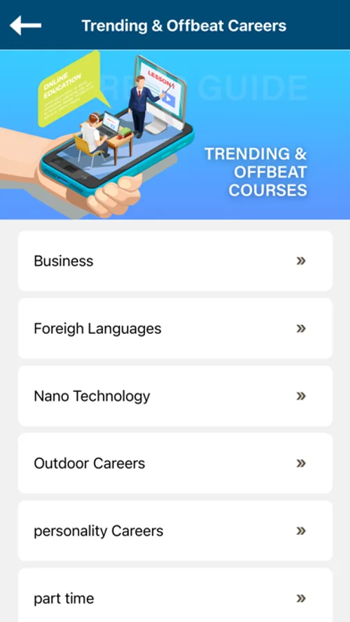 This app will guide you about the regular courses, offbeat courses as well as trending courses and job prospects related to the selected course and also top institutes offering those courses & type of the jobs you get in the related field.