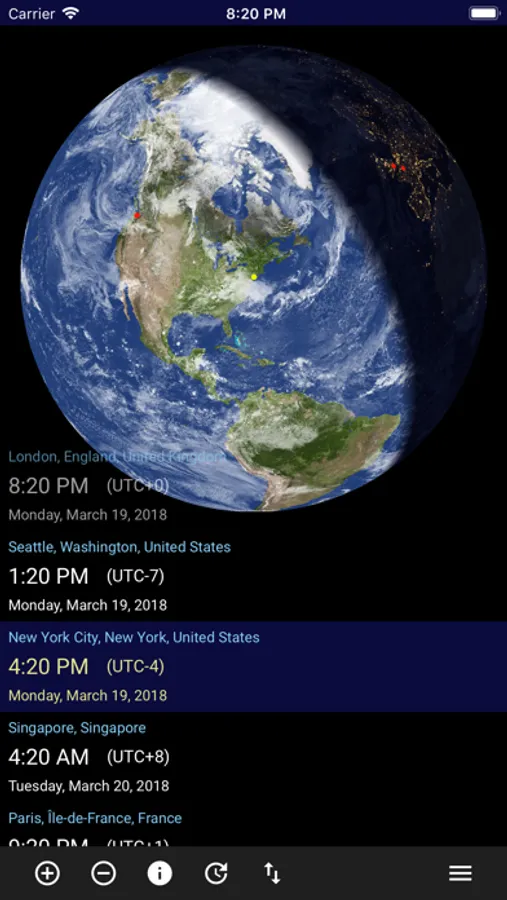 This application provides information about local times in cities around the world. Additionally it shows Earth so it is very easy to find out, if it is day-time or night at specific locations. It is possible to select a city and the globe rotates, so that selected city is in the center.