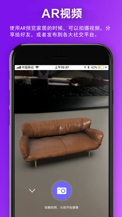 用户在使用AR预览家居的时候,可以将虚实结合的场景画面拍成视频,分享给好友,或者发布到各大社交平台,获取更多的购买建议。并且,我们在视频上增加了AR家居的品牌信息,使得入驻的家居品牌能够得到更多的曝光。