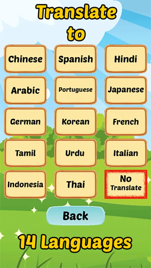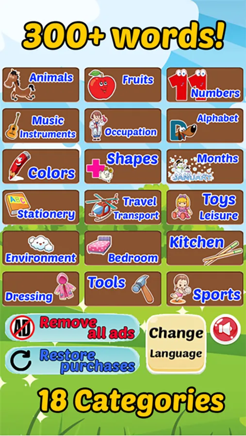 There are totally 18 categories, like body parts, foods, numbers, colors, animals and etc., for more than simple 300 words you need to know. Each word, you will learn how to spell and pronounce in English with many languages translation as selected. Moreover, there are attractive pictures and meanings for every single word!