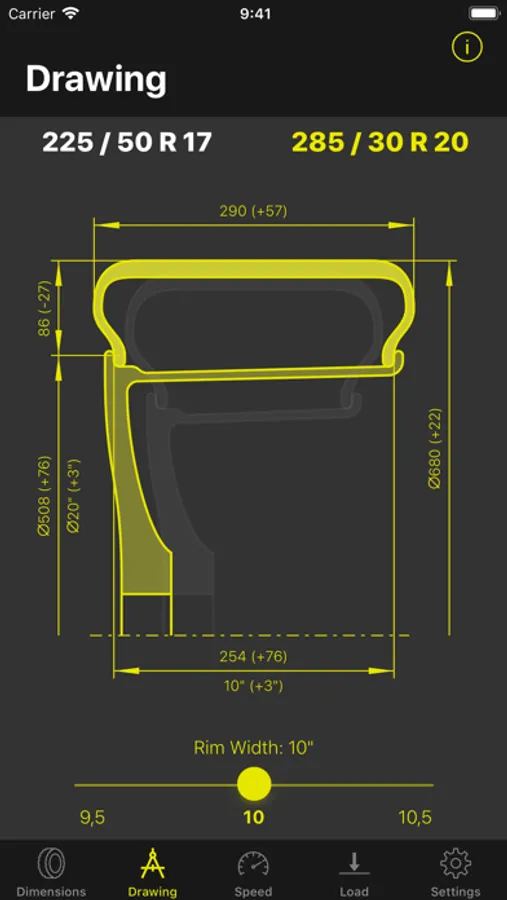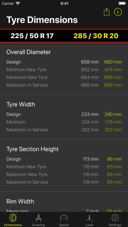 In the tyre comparison mode the dimensions of two different tyres can be compared.