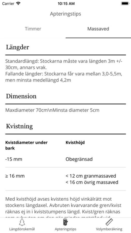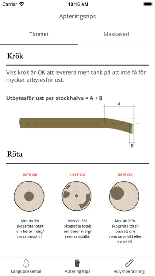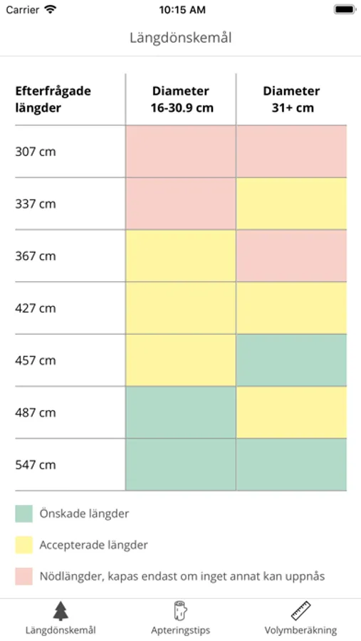 Den första ger information om vilka längder som efterfrågas av olika timmersortiment samt dess prisavdrag/tillägg.