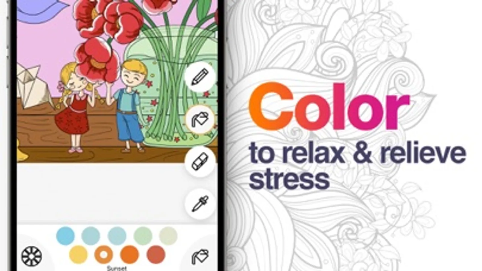 Coloring Book for Adults is a free app and does not require any internet connection. Have fun with it in the garden, while kids play video games, or during a long flight. Relax and be creative. You can play it online or offline!