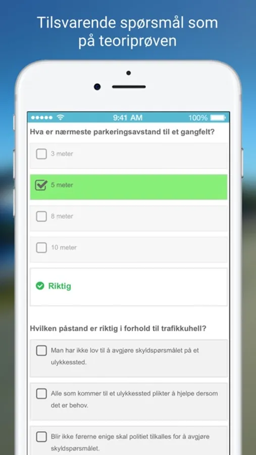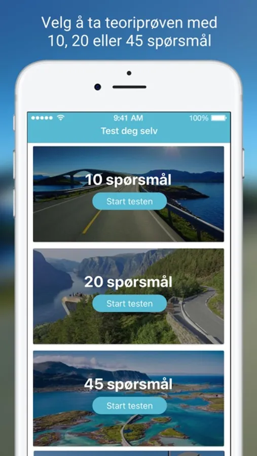 • Velg mellom full teoriprøve med 45 spørsmål og raskere tester med 10 eller 20 spørsmål