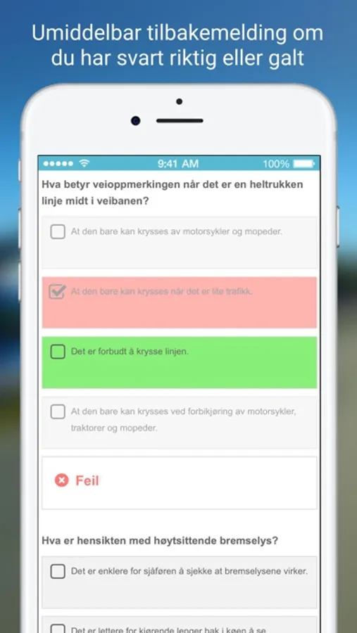 • Umiddelbar tilbakemelding om du har svart riktig eller galt, og en totalscore på slutten av prøven
