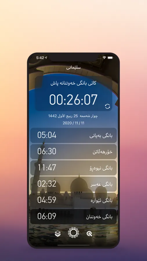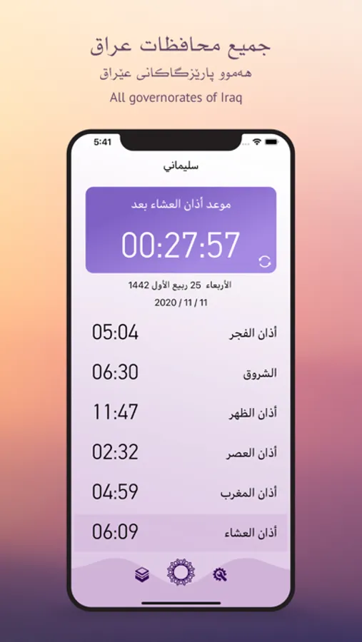 Prayer Times is an app that allows you to know about the times of your prayers in World and all governorates of Iraq and many towns and subregions of Kurdistan. However, If you could not find your location listed in the app, it would be no problem as our app has the feature that enables you to create prayer times for your location according to the nearest region.