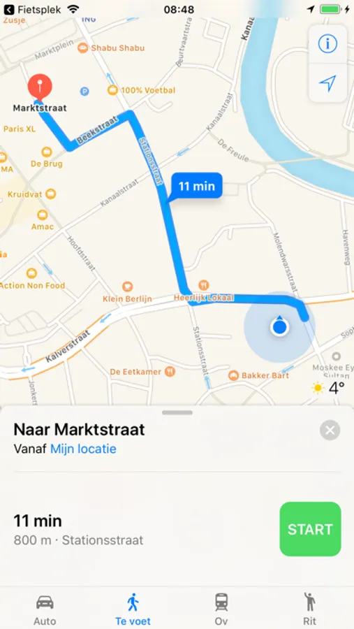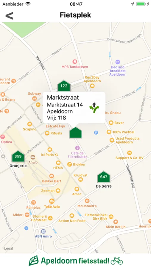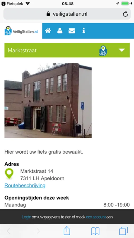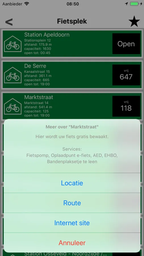 Klikken op een stalling geeft je de mogelijkheid om de route naar een stalling te vinden en meer informatie over de stalling te bekijken. Bij voorbeeld welke services beschikbaar zijn in een stalling.