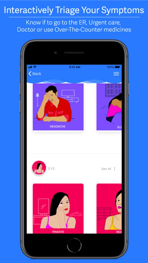 Triage your self-care healthcare needs. First, rule out emergency room visit. Then do you need to seek urgent care? You rule that out. And if you do, the app will tell you nearby urgent care facilities.