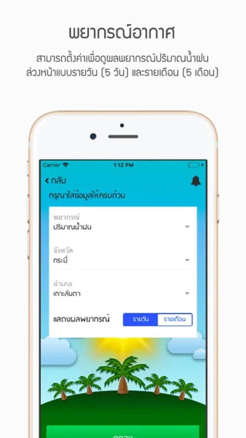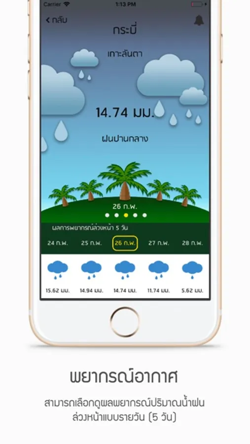 - เวอร์ชั่นนี้แจ้งเตือนการใส่ปุ๋ยได้เฉพาะประมาณน้ำฝนในจ.กระบี่ บริเวณอ.เมืองและอ.เกาะลันตา (จะเพิ่มอำเภออื่นๆอีกเร็วๆนี้)