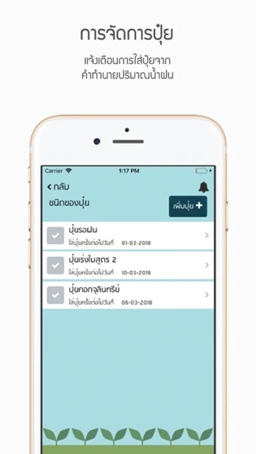 - ระบบจะเตือนผู้ใช้งานเมื่อถึงวันที่ต้องใส่ปุ๋ยรอบต่อไปตามที่ผู้ใช้งานตั้งค่าไว้ โดยถ้าวันนั้นมีฝนตก ระบบจะแนะนำวันถัดไปที่สามารถใส่ปุ๋ยได้ให้ด้วย - เมื่อผู้ใช้งานใส่ปุ๋ยแล้วต้องมากดปุ่ม Check หน้ารายการปุ๋ยนั้น เพื่อให้ระบบเตือนวันใส่ปุ๋ยรอบถัดไป