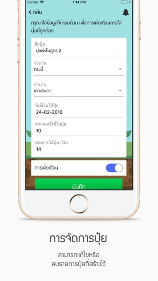 - สามารถตั้งวันที่เริ่มใส่ปุ๋ย, จำนวนครั้งที่ใส่ปุ๋ย และรอบของการใส่ปุ๋ย (วัน)
