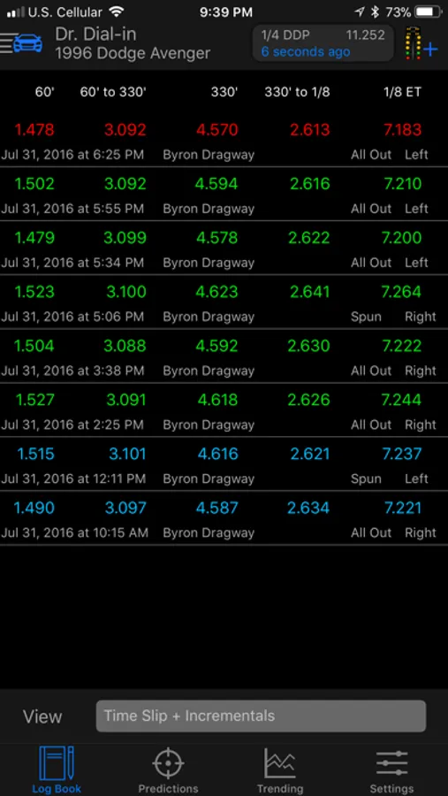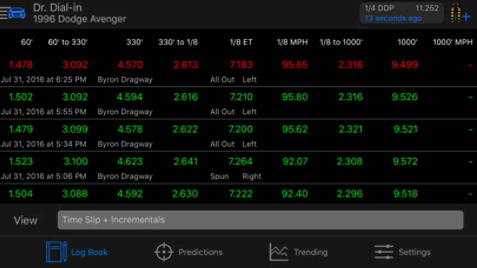 The Dr. Dial-in Log Book allows you to switch views for quick access to the data you're most interested in. It comes with four default views: All, Predictions, Time Slip, and Time Slip + Incrementals. Create new views selecting your own data fields and order them the way you like.