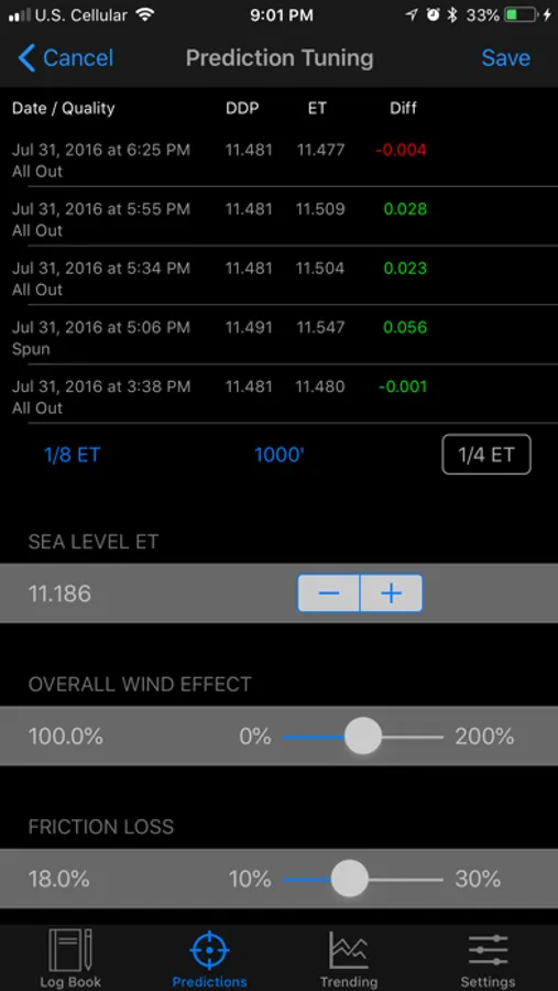 Every pass entered into Dr. Dial-in with weather information will log the prediction. This allows you to see how well the Dr. Dial-in Prediction Engine (DDPE) is doing and helps you build confidence for future predictions. Applications that provide predictions without a way to determine its accuracy only lead to second guessing yourself and uncertainty.