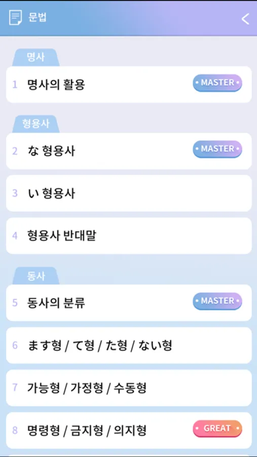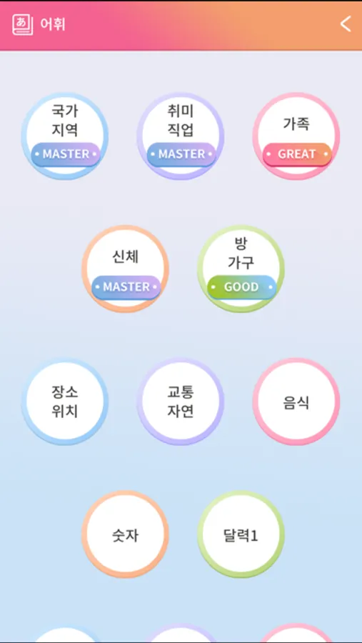 각종 명사형 어휘부터 간단한 인사말까지 다양한 어휘를 학습할 수 있습니다.